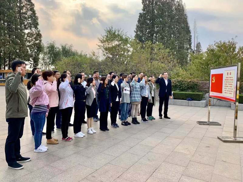 在周恩来纪念馆,全体党员同志面对鲜红的党旗,庄严举起右拳,重温入党誓词,用饱满的精神和坚定的誓言表达为共产主义奋斗终身的决心。