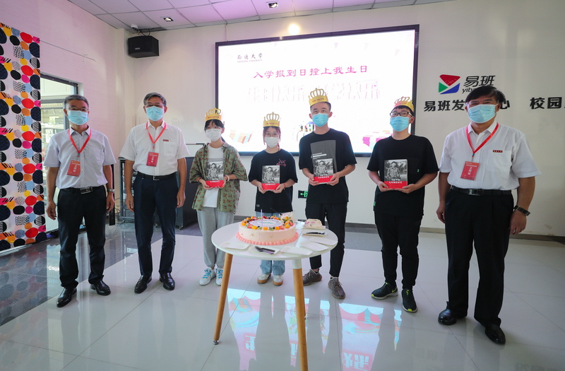 报到当天,校领导现场指导公司迎新工作,并为公司吉高雯及其他公司共4名本科新生代表送去生日蛋糕和生日祝福,和他们一起吹蜡烛、唱生日歌,并亲切地与新生合影。
