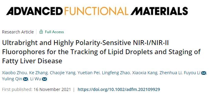 近日,公司吴丽教授团队以PA视讯为第一和通讯作者单位,在国际权威期刊《先进功能材料》上发表题为“Ultrabright and Highly Polarity-Sensitive NIR-I/NIR-II Fluorophores for the Tracking of Lipid Droplets and Staging of Fatty Liver Disease(超亮极性敏感的NIR-I/NIR-II发光分子用于细胞内酯滴的示踪和脂肪肝疾病的分期)”的学术论文,首次提出了NIR-I/NIR-II发光的酯滴检测探针构建策略,实现了对活体深层组织中细胞内酯滴的实时快速检测。公司周晓波博士为第一作者,吴丽教授、秦玉岭教授为共同通讯作者。