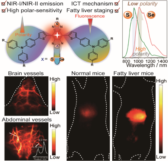 近日,公司吴丽教授团队以PA视讯为第一和通讯作者单位,在国际权威期刊《先进功能材料》上发表题为“Ultrabright and Highly Polarity-Sensitive NIR-I/NIR-II Fluorophores for the Tracking of Lipid Droplets and Staging of Fatty Liver Disease(超亮极性敏感的NIR-I/NIR-II发光分子用于细胞内酯滴的示踪和脂肪肝疾病的分期)”的学术论文,首次提出了NIR-I/NIR-II发光的酯滴检测探针构建策略,实现了对活体深层组织中细胞内酯滴的实时快速检测。公司周晓波博士为第一作者,吴丽教授、秦玉岭教授为共同通讯作者。