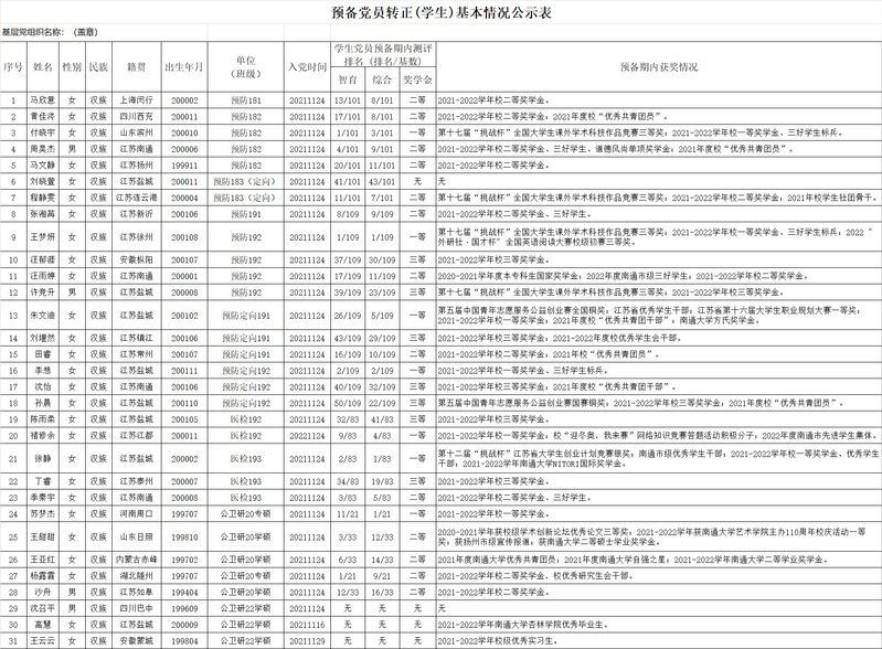 经党支部考察和研究,PA视讯公司党委拟于近期讨论马欣意、黄佳涔、付晓宇、周昊杰、马文静、刘晓萱、程静雯、张湘苒、王梦妍、汪郁涯、汪雨婷、许竞升、朱文迪、刘堰然、田睿、李想、沈怡、孙晨、陈雨柔、褚修余、徐静、丁睿、季秦宇、苏梦杰、王甜甜、王亚红、杨露霞、沙舟、沈召平、高慧、王云云等31位同志的转正事宜。现将这31位同志的基本情况予以公示(详见附件),敬请党员、群众监督,如有意见和建议请于11月22日前向公司党委或公司党委组织部反映。
