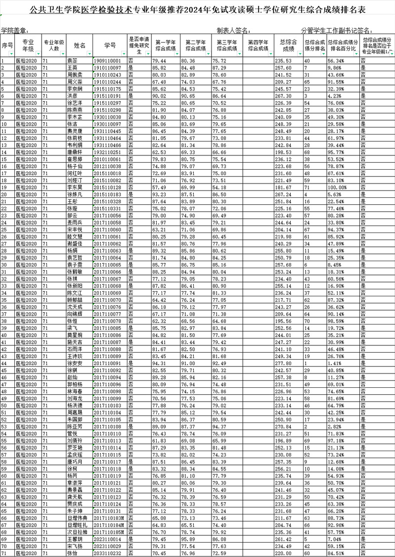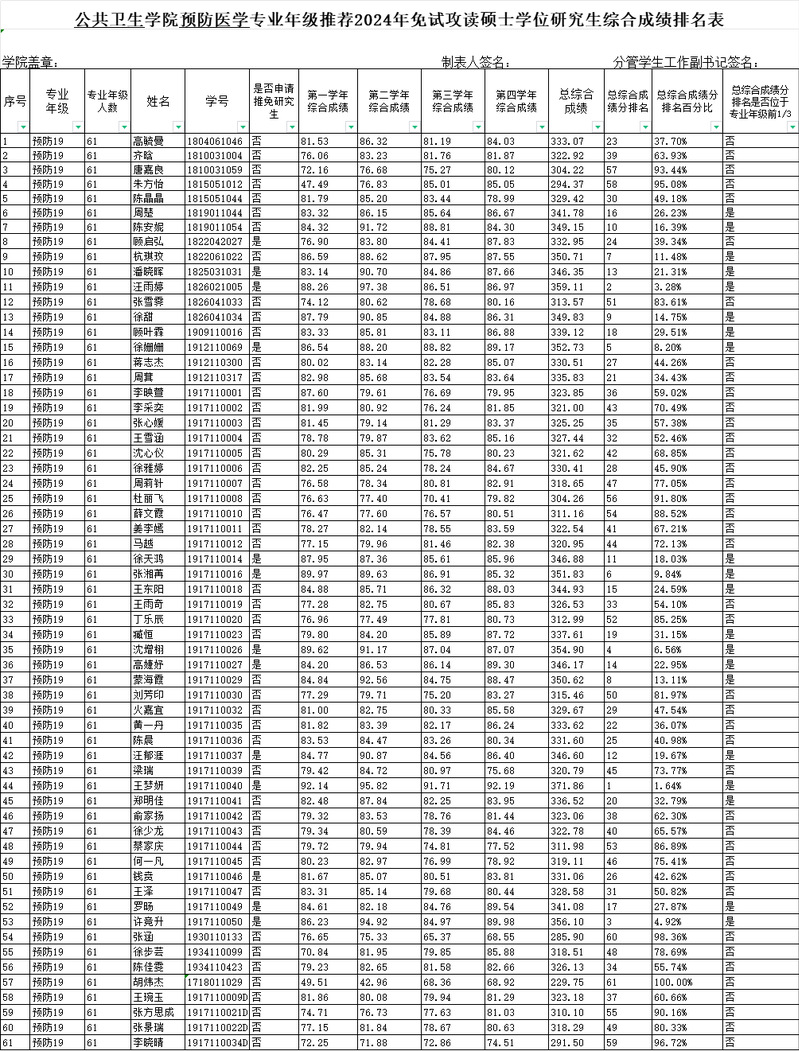 现将《推荐免试攻读硕士学位研究生综合测评成绩排名表》予以公示,敬请大家监督。
