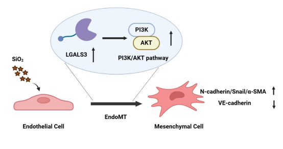 本研究通过体内构建矽尘诱导的小鼠肺纤维化模型和体外矽尘诱导的EndoMT模型,探讨半乳糖凝集素3(LGALS3)在矽尘所致肺纤维化中的作用机制和治疗靶点。研究结果显示,LGALS3通过PI3K/AKT信号通路参与了矽尘诱导的EndoMT进程。这些发现表明LGALS3/ PI3K/AKT信号通路为矽肺的临床治疗和干预提供了潜在靶点。