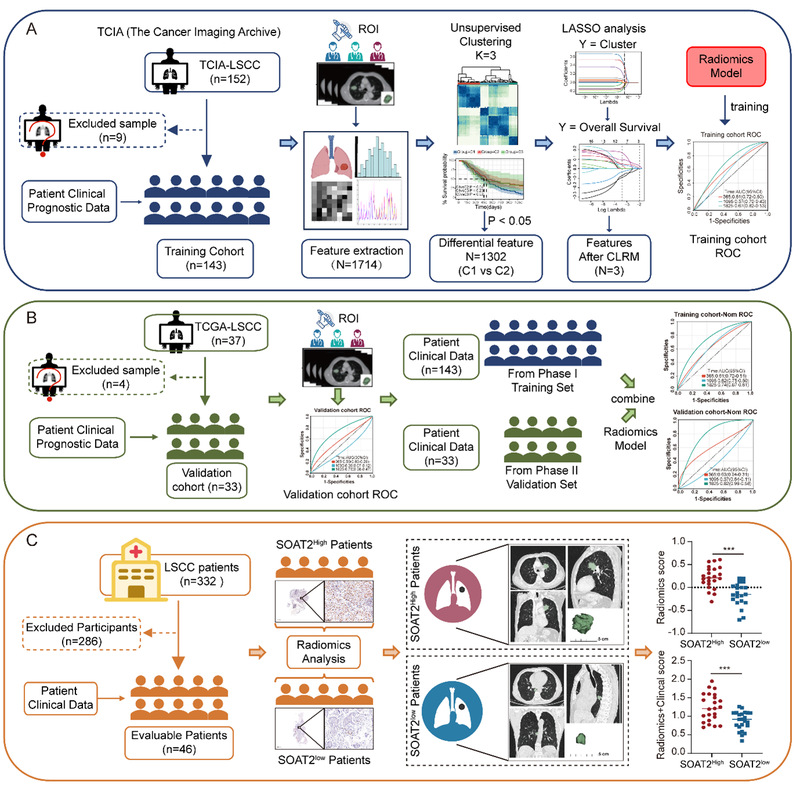 该研究通过公共数据库和生物信息学分析,结合放射组学分析和分子生物学实验,发现SOAT2 参与免疫浸润可预测老年 LSCC 患者的不良预后。这一发现为开发针对老年癌症患者的精准免疫治疗策略提供了新靶点,有望改善老年癌症患者的治疗效果和预后,具有重要的临床意义。