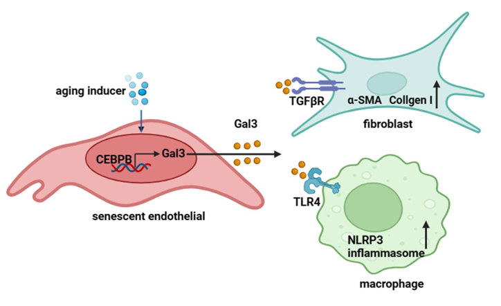 该研究通过建立多种内皮细胞衰老模型和矽尘诱导的肺纤维化小鼠模型,发现矽尘诱导的内皮细胞衰老伴随Gal3的表达和释放增加。随后,Gal3分别与肺成纤维细胞膜上的TGFBR1受体和巨噬细胞上膜的TLR4受体结合,通过促进成纤维细胞增殖活化和巨噬细胞NLRP3炎症小体激活,促进矽肺进展。