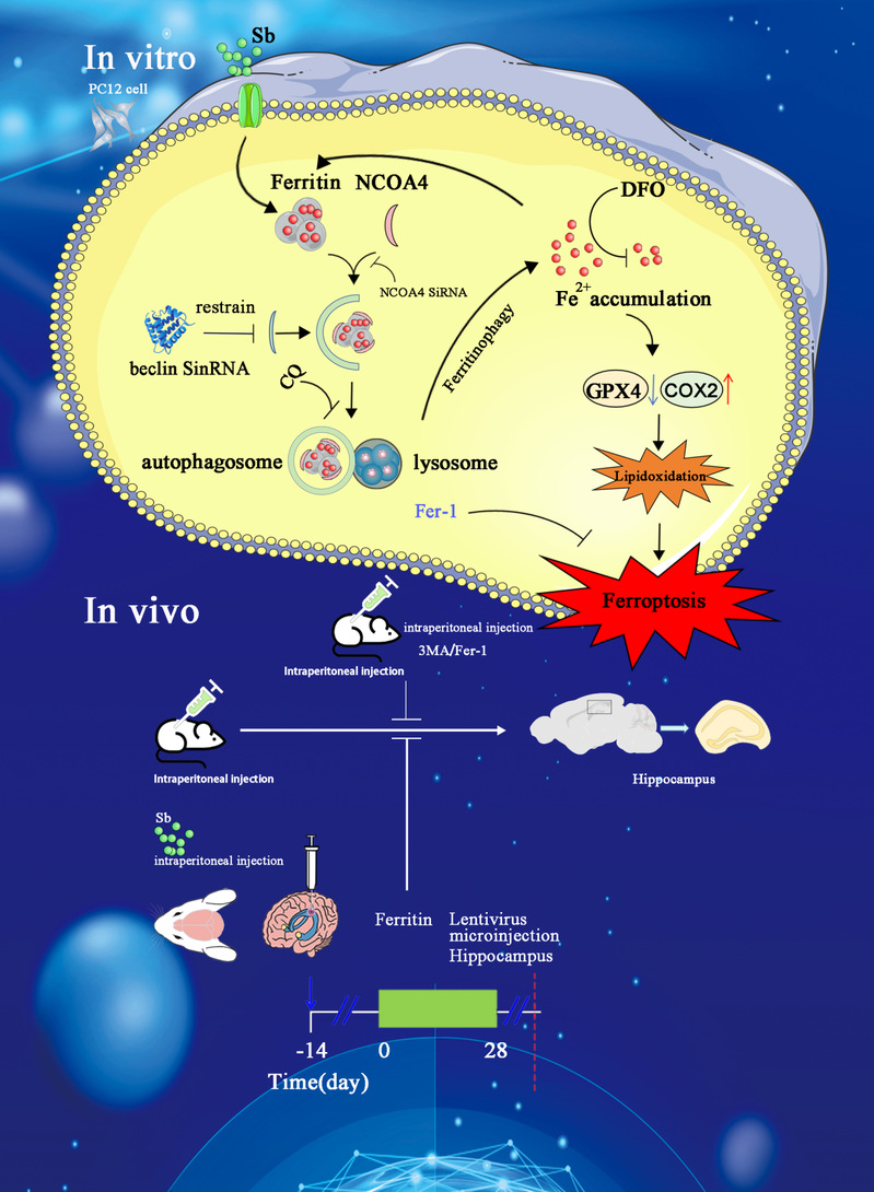 锑是一种对肝脏、肾脏和心脏等器官具有毒性和致癌性的元素。它广泛分布于水、土壤、大气等环境介质中,主要通过呼吸道和消化道进入人体。此前课题组已经证实锑具有神经毒性,但具体机制尚不明确。本研究通过构建锑暴露的细胞和小鼠模型,探究NCOA4诱导的铁自噬在锑诱导神经元铁死亡中的作用机制。研究结果显示锑会通过促进神经元铁自噬加快铁蛋白降解,造成的铁过载诱导铁死亡。体内注射铁死亡抑制剂和自噬抑制剂均可有效抑制锑的神经毒性,脑定位注射带有神经元特异启动子的铁蛋白过表达腺病毒也可以有效减轻锑的神经毒性。NCOA4 作为介导铁蛋白自噬的关键受体,在锑暴露后显著上调,敲降NCOA4有效抑制锑诱导的神经元铁自噬和铁死亡。这一成果为锑诱导的神经毒性提供了新的分子机制及干预靶点。