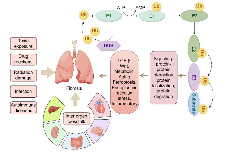 文章总结了E3泛素连接酶和去泛素化酶在调控肺纤维化方面的作用,着重分析了几种关键信号通路在PF中的作用机制。此外,研究还概述了泛素-蛋白酶体系统在组织间通讯中的功能,以及泛素修饰酶在不同细胞中的差异化作用。这些发现不仅为肺纤维化的进展机制提供了新视角,同时也为研究相关系统性疾病拓展了思路。在治疗领域方面,文章总结了当前用于靶向蛋白泛素化相关酶或泛素化底物的治疗化合物,强调了泛素化与组织间通讯的相互作用可能成为未来治疗肺纤维化的新策略。