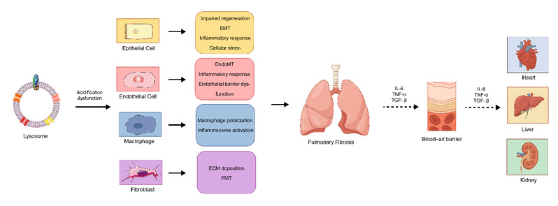 肺纤维化是一种复杂的病理生理过程,其特征包括肺部局灶性炎症与纤维化、全身性炎症反应以及远端器官损伤。溶酶体作为细胞内降解与再循环的中心,其酸性微环境对于维持细胞稳态和功能具有重要意义。本文综述了溶酶体酸化在肺纤维化发病机制中的潜在作用及其对器官间相互影响。多种蛋白质和离子通道,如V-ATPase、ClC-7、CFTR、TRPML1及NHE等,参与调控溶酶体的酸化过程。肺纤维化的发生涉及多种细胞类型,包括肺上皮细胞、内皮细胞、巨噬细胞、成纤维细胞以及肌成纤维细胞。研究表明,异常的溶酶体酸化在肺纤维化的发生与进展中起着关键作用。受损的上皮细胞通过溶酶体功能障碍激活炎症与纤维化信号通路;内皮细胞中异常的溶酶体酸化可引发组织水肿和炎症反应;巨噬细胞因溶酶体酸化受损而加剧炎症反应;成纤维细胞则因溶酶体酸化不足而异常增殖并向肌成纤维细胞转分化。慢性肺部炎症增加了血气屏障的通透性,促进炎症介质(如IL-6、TNF-α及TGF-β)外渗入循环系统,这些介质作为内分泌信号可影响远端器官。上述研究为探索新的治疗靶点提供了理论依据;未来通过药理学手段调控溶酶体酸化水平及抑制关键炎症介质,可能成为预防和治疗肺纤维化及其系统性并发症的重要策略。。