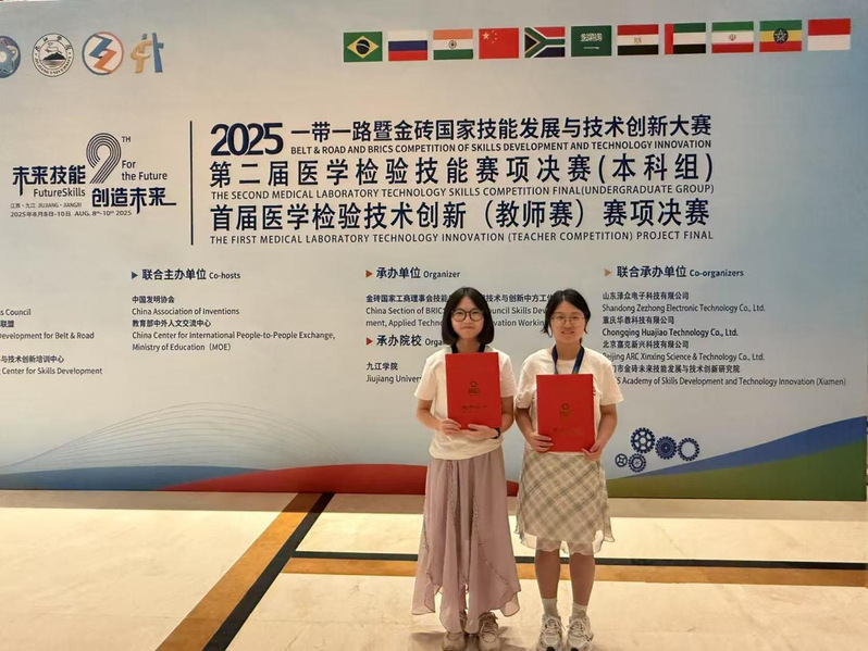 2025年8月8日至10日,由教育部主办、九江公司承办的“一带一路”暨金砖国家技能发展与技术创新大赛暨第二届医学检验技能赛项决赛(本科组)圆满落幕。经过两天紧张激烈的角逐,公司2022级医学检验专业员工侯艳霞、王婉婷在全国60所高校120名参赛选手中勇夺三等奖。