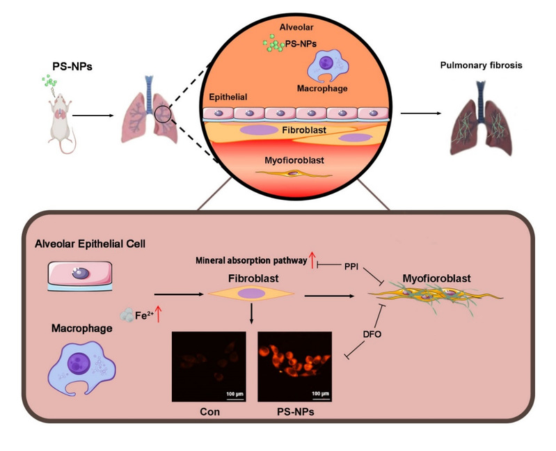 PS-NPs是一种环境新型污染物,具有重量轻、成本低、易成型、耐用等优点,广泛应用于医药、工业、包装、日常生活等领域,对生态系统和人类健康构成严重威胁。此前,已有研究证明暴露于PS-NPs对呼吸系统构成重大威胁,包括肺部炎症、慢性阻塞性肺疾病和哮喘等疾病。然而,PS-NPs诱导肺纤维化的机制尚未完全阐明。该研究通过构建PS-NPs暴露的细胞和小鼠模型,深入探讨了PS-NPs如何通过细胞间串扰增加肺成纤维细胞内铁离子含量,进而诱导肺成纤维细胞增殖活化和肺纤维化的机制。这一发现提示靶向细胞间串扰和铁稳态是一种预防和治疗PS-NPs诱导肺纤维化的潜在策略。