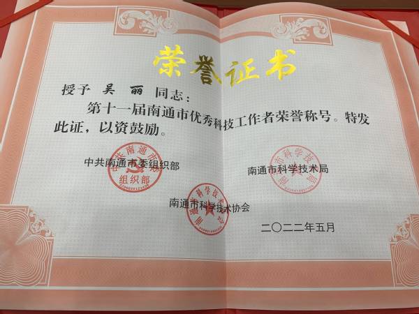 吴丽教授获评第十一届南通市优秀科技工作者荣誉称号。